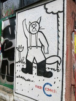 Než se stačilo s cikorkou stát něco velmi ošklivého, sousední militantní sluníčkáři na něj poštvali divokého prasopsa a tak Nácíček skončil v místní tůni zvané Jedličkova louže. Divoký pes je ovšem třídní nepřítel jak buržoazie, tak proletářů i radikální pravice, takže netrvalo dlouho a Nácíček si mohl na ramena přidělat desátnické pecky, protože se k němu přidal i Franta Kuldanů a kozel Bobeš, kteří mu pomohli z té šlamastyky[6]. Franta Kuldanů se v nově vzniklé buňce fašistického hnutí odporu věnoval Public relations coby vlídná tvář nastupující totality a kozel Bobeš se svými rohy sloužil jako základ represivních složek.