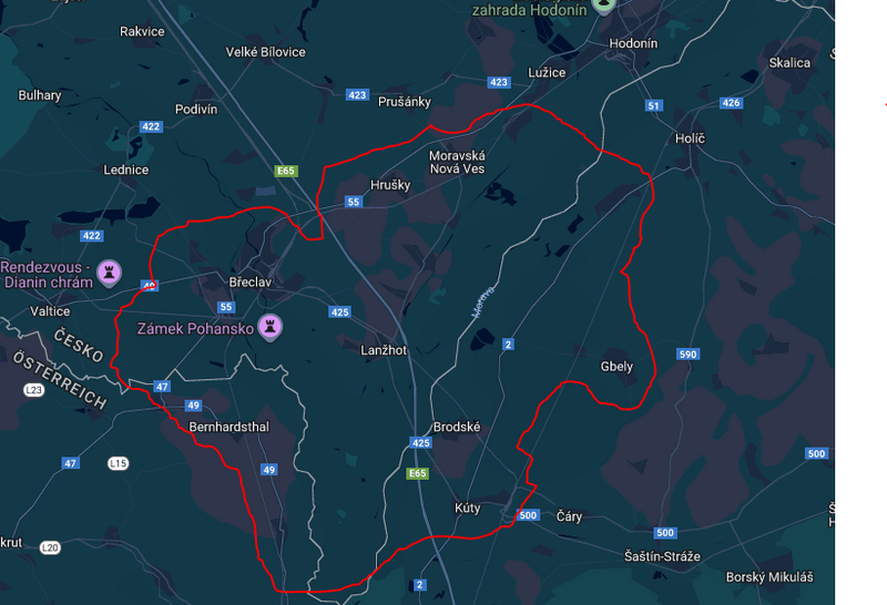 Hranice PKRR vyznačeny červeně na Gůgl meps